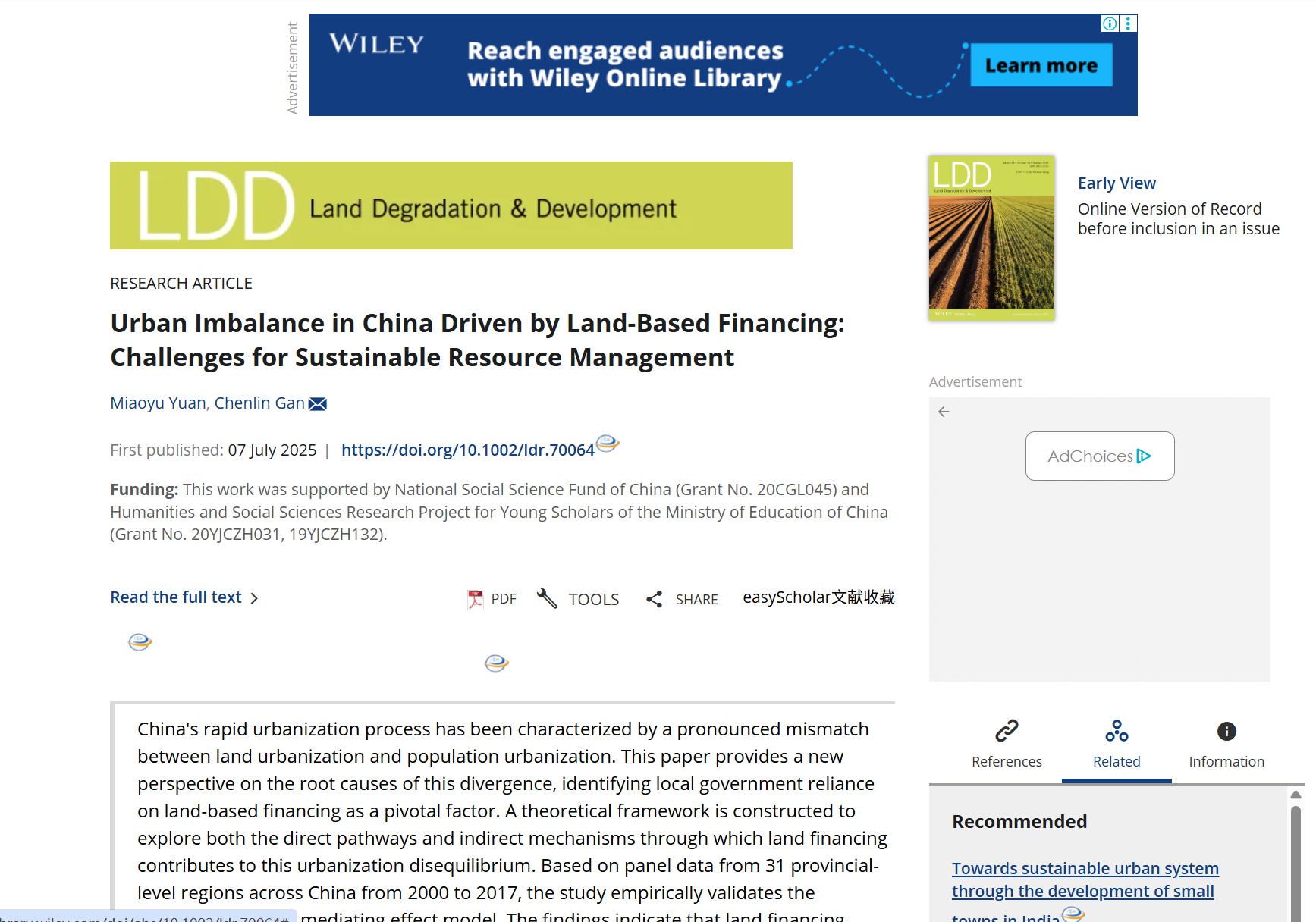 近日,我院袁妙彧老师与甘臣林老师合作的论文《Urban Imbalance in China Driven by Land-Based Financing: Challenges for Sustainable Resource Management》(土地融资驱动下的中国城市发展失衡:可持续资源管理面临的挑战)发表于国际知名期刊Land Degradation & Development(SCI/SSCI二区,Wiley出版)。