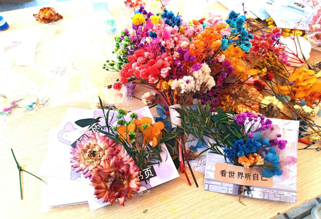 活动现场,长桌上摆满了色彩缤纷的材料:盛放的干花束、小巧的石膏娃娃白模、颜料与胶水工具,还有印着文艺短句的拼贴诗材料。同学们或围坐在桌前,手持画笔为石膏娃娃渲染上独特的色彩;或挑选干花与文字卡片,将“看世界听自己”“夜里看海”等短句与花材拼贴成自我灵魂的心曲,展示内心深处的期待与诗意。