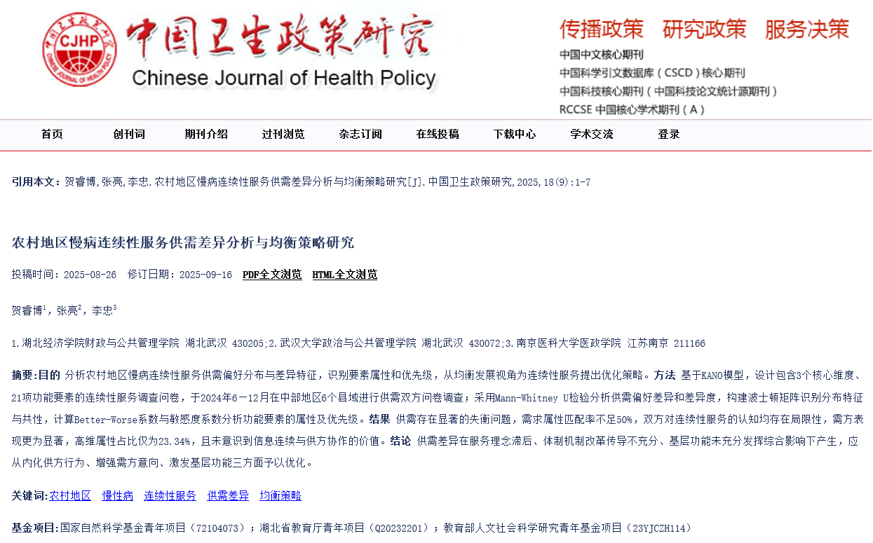 近日,我院贺睿博老师与武汉大学张亮教授、南京医科大学李忠副教授的合作论文《农村地区慢病连续性服务供需差异分析与均衡策略研究》发表于国内卫生政策与管理知名期刊《中国卫生政策研究》(CSCD核心)。该论文系贺睿博老师国家自然科学基金项目“基于慢病轨迹的县域连续性服务供需均衡分析与优化策略研究”(编号:72104073)研究成果。
