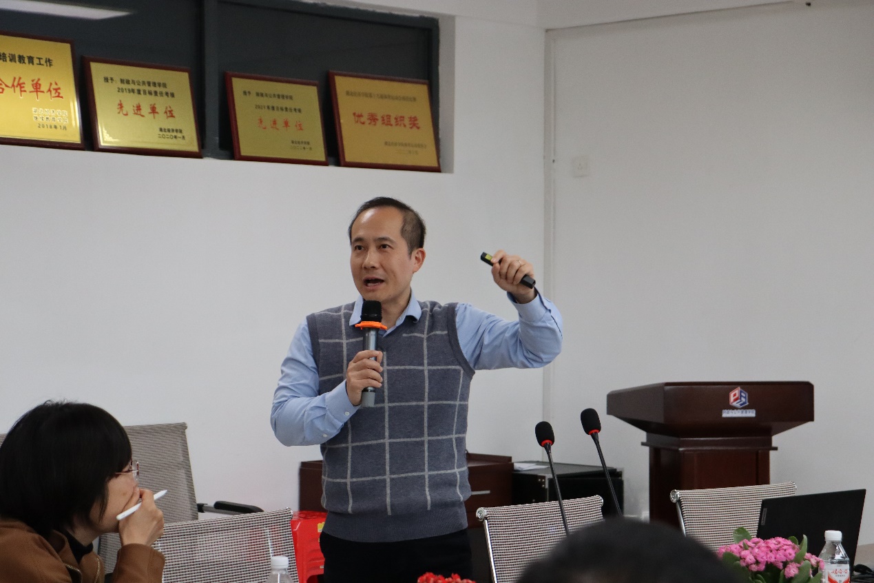 11月30日下午,由我院主办的“明辨财税大讲堂”系列学术活动在明辨楼420会议室举行。上海财经大学财税投资学院毛捷教授应邀作题为《AI赋能融资平台改革转型研究》的学术讲座。讲座由院长魏涛教授主持,学院科研骨干教师及2025级税务专硕研究生参加。