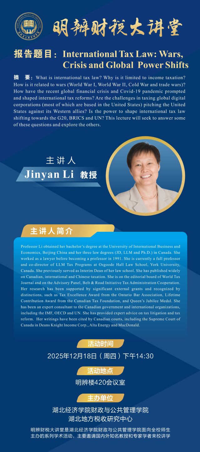 明辨财税大讲堂第15期丨Li Jinyan:International Tax Law: Wars, Crisis and Global Power Shifts