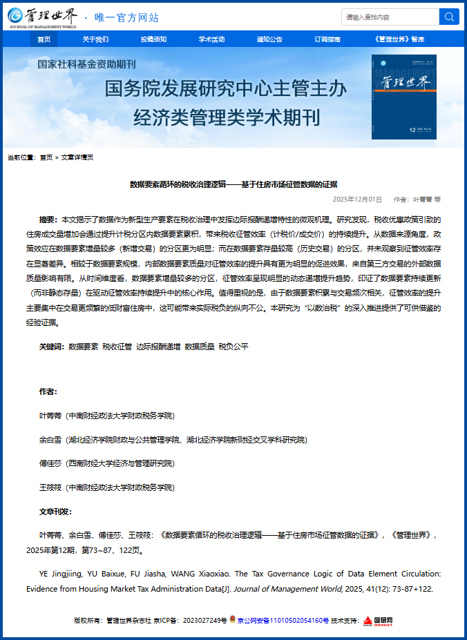 近日,我院余白雪老师与中南财经政法大学叶菁菁、王筱筱以及西南财经大学傅佳莎的合作论文《数据要素循环的税收治理逻辑:基于住房市场征管数据的证据》,在国内顶级期刊《管理世界》2025年第12期正式发表,余白雪老师为通讯作者。《管理世界》是国务院发展研究中心主管、主办的经济类管理类学术期刊,是国家新闻出版部门认定的学术期刊、“百强社科期刊”、国家自然科学基金委员会认定的学术期刊以及国家社会科学基金重点资助期刊、优秀期刊。