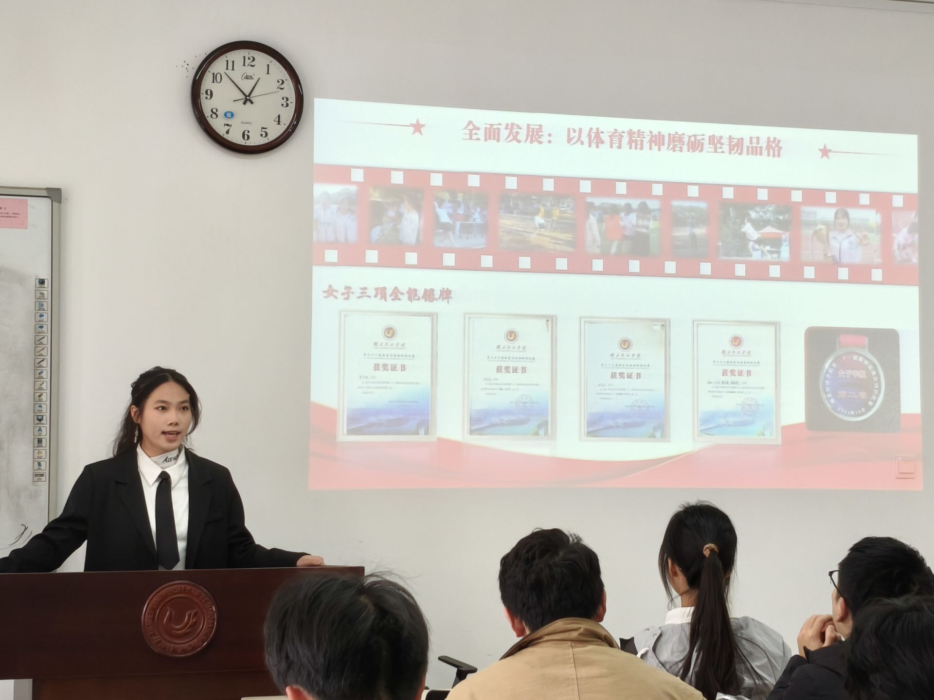 本次答辩会上,4位候选人依次登台,结合PPT从专业成绩、学科竞赛、社会实践、学生工作等维度展开汇报。她们不仅展示了参与科研项目、投身志愿服务的实践成果,部分候选人还分享了在学生组织中锤炼本领、服务集体的成长历程。汇报内容既不乏清晰的数据支撑,又饱含对学业深耕与个人成长的深刻思考,充分彰显了我院学子的优良精神风貌。最终,经评委审慎评议,财政实验2441班蔡思妍同学脱颖而出,成功斩获本次美乐维奖学金。